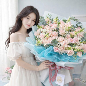 Điểm xuyết giữa những đóa hồng là baby trắng tinh khôi và hoa phụ nhỏ xinh, tạo hiệu ứng bồng bềnh như một bản tình ca nhẹ nhàng. Lá bạc eucalyptus xanh mát giúp tổng thể thêm phần hài hòa, thanh thoát. Lớp giấy gói xanh pastel phối trắng hiện đại kết hợp nơ hồng nổi bật tạo nên tổng thể vừa sang trọng, vừa ngọt ngào.