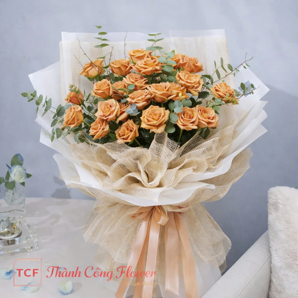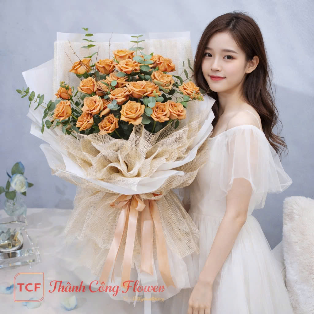 Điểm đặc biệt của bó hoa hồng màu cam đẹp tại Thành Công Flower chính là phong cách thiết kế mang hơi hướng “nàng thơ” nhẹ nhàng. Lớp giấy gói phối giữa trắng và vải lưới be tạo cảm giác mềm mại, tự nhiên nhưng vẫn rất thời thượng. Nơ lụa màu cam nhạt được thắt tinh tế ở phần thân bó, giúp tổng thể trở nên hài hòa và cuốn hút hơn.