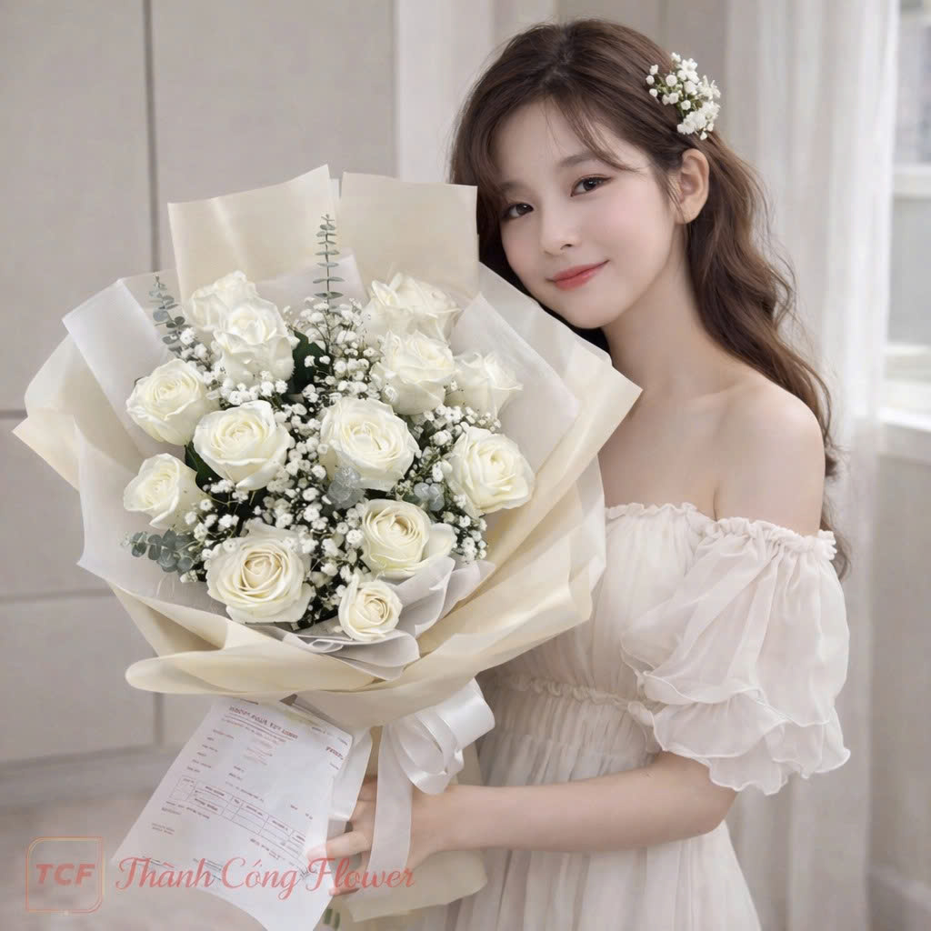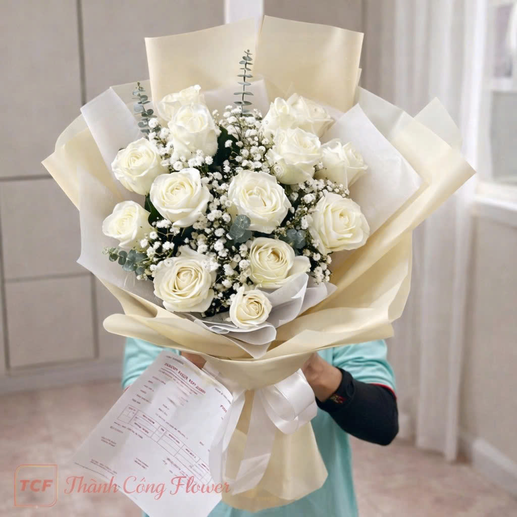Thiết kế bó hoa “Ánh Sao Diệu Êm” theo phong cách hiện đại, tối ưu bố cục tròn đều, tạo cảm giác đầy đặn và hài hòa. Hoa hồng trắng được kết hợp cùng baby trắng li ti và lá bạc eucalyptus nhằm tăng chiều sâu thị giác, đồng thời tạo điểm nhấn mềm mại cho tổng thể. Giấy gói cao cấp tông kem – trắng được phối nhiều lớp, xử lý nếp gấp tinh tế để mang lại hiệu ứng sang trọng nhưng không quá cầu kỳ. Phần nơ lụa được thắt thủ công, cân chỉnh tỉ mỉ nhằm đảm bảo tổng thể bó hoa luôn chỉnh chu ở mọi góc nhìn