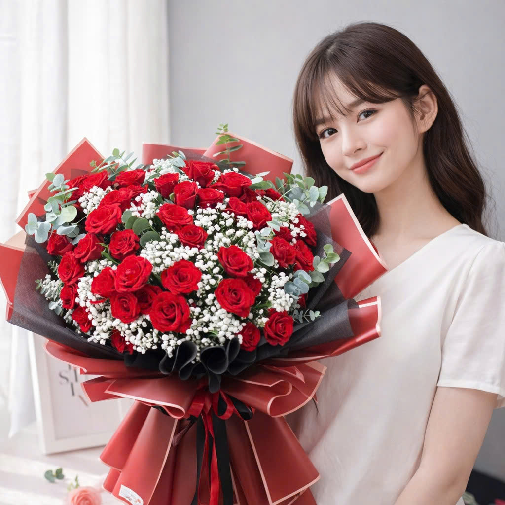 Bó hoa được thiết kế theo phong cách hiện đại, lấy sắc đỏ chủ đạo biểu tượng của tình yêu mãnh liệt, sự đam mê và sang trọng. Những bông hồng đỏ được tuyển chọn kỹ lưỡng, nở đều, form đẹp, kết hợp cùng hoa baby trắng nhỏ xinh tạo nên hiệu ứng tương phản đầy cuốn hút. Xen kẽ là lá bạc eucalyptus mang lại cảm giác tươi mới, tự nhiên nhưng vẫn giữ được sự cao cấp trong tổng thể. Đây chính là điểm nhấn giúp bó hoa không chỉ đẹp mà còn mang hơi thở của xu hướng cắm hoa hiện đại.