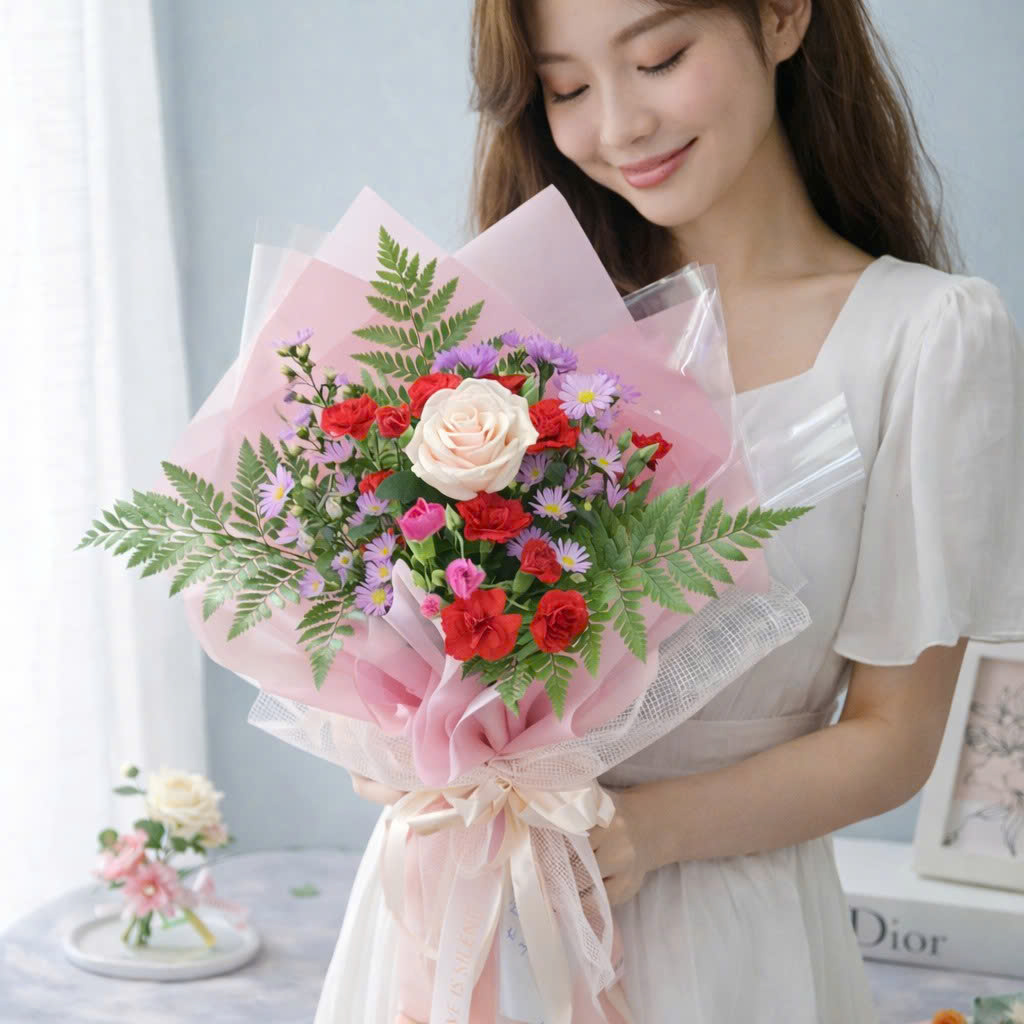 Bó hoa mang phong cách dịu dàng, phù hợp với những khoảnh khắc đời thường nhưng vẫn đủ ý nghĩa để trở thành một kỷ niệm đáng nhớ. Đó có thể là lời cảm ơn, lời chúc nhẹ nhàng hay đơn giản chỉ là một cái ôm bằng hoa dành cho người bạn trân quý.