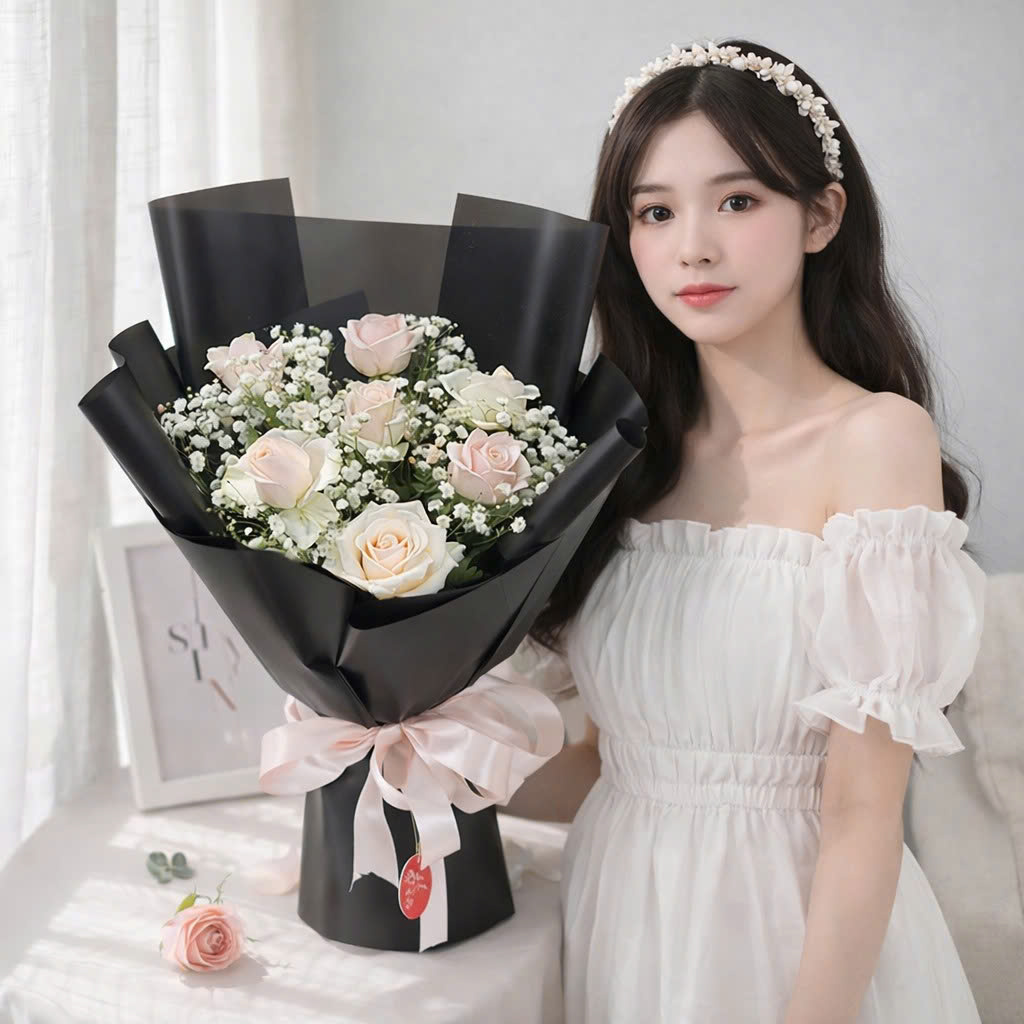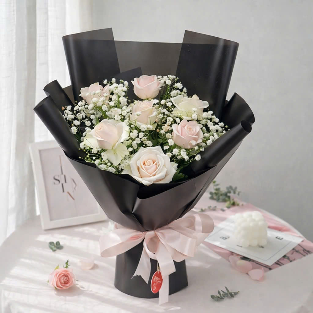 Thiết kế của bó hoa hồng kem 7 bông – Lời Yêu Dịu Dàng mang phong cách hiện đại nhưng vẫn giữ được nét lãng mạn đặc trưng của bó hoa hồng đẹp. Bảy bông hoa hồng kem tươi được sắp xếp hài hòa ở trung tâm, xen kẽ cùng những bông hoa baby trắng nhỏ xinh tạo nên cảm giác nhẹ nhàng và tinh khôi. Lớp giấy gói đen sang trọng giúp tôn lên vẻ thanh lịch của hoa, đồng thời tạo nên sự tương phản tinh tế khiến bó hoa hồng kem đẹp nhất trở nên nổi bật và cuốn hút.
