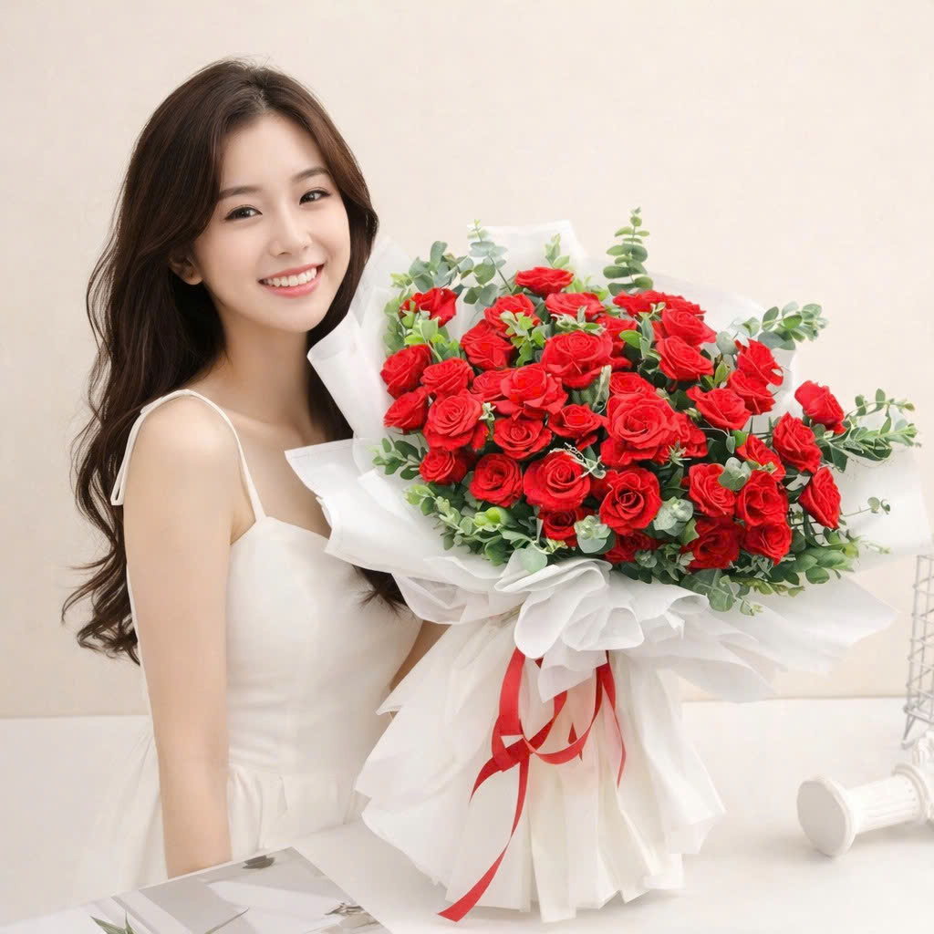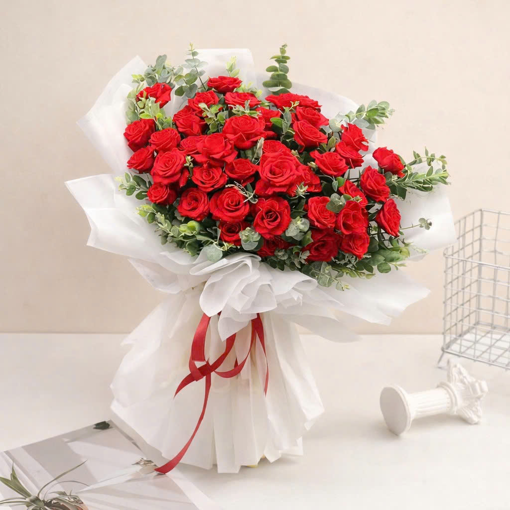 Bó hoa được kết từ những bông hồng đỏ tươi thắm, cánh hoa dày, form chuẩn, tượng trưng cho một tình yêu nồng cháy và bền vững. Điểm nhấn của sản phẩm nằm ở lớp giấy gói trắng mềm mại, kết hợp cùng nơ đỏ nổi bật, tạo nên tổng thể hài hòa giữa sự thanh lịch và quyến rũ. Đây chính là mẫu bó hoa hồng đỏ đẹp phù hợp để tặng người yêu, vợ, hoặc người thương trong các dịp như kỷ niệm, hoa sinh nhật, ngày Valentine hay cầu hôn.