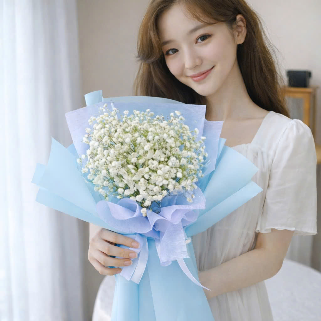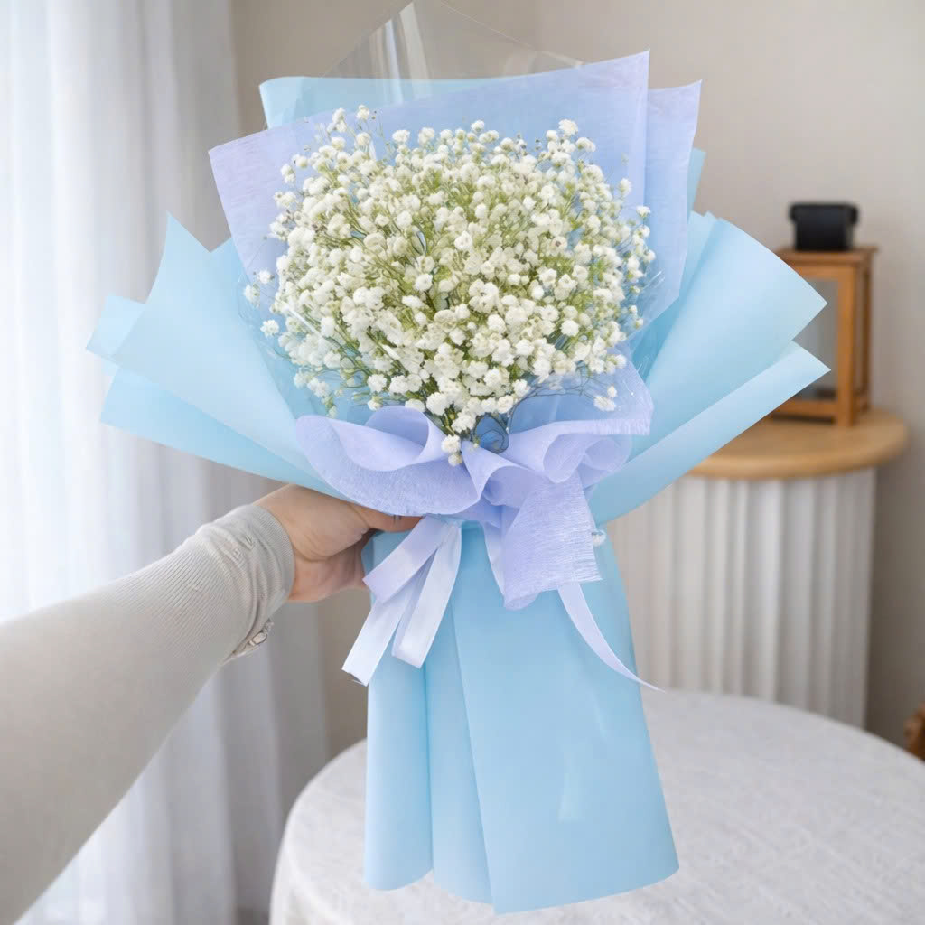 Mỗi bó hoa baby trắng thường sử dụng từ 5 đến 7 cành baby lớn, đã được xử lý nở đều, tạo form tròn đầy và cân đối. Hoa được chọn lọc kỹ ngay từ sáng sớm, đảm bảo độ tươi mới, màu trắng trong trẻo và không bị ngả vàng. Giấy gói được phối tone xanh pastel hoặc trắng sữa, kết hợp nơ vải mềm, giúp tổng thể bó hoa trở nên nhẹ nhàng và sang trọng.