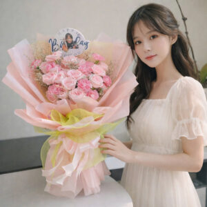 Tại thanhcongflower.com, mỗi bó hoa đều được thiết kế thủ công bởi đội ngũ florist giàu kinh nghiệm, đảm bảo sự cân đối về màu sắc, kích thước và độ bung nở của hoa. Shop cam kết sử dụng hoa tươi mới trong ngày, giúp bó hoa giữ được vẻ rạng rỡ lâu hơn khi trao đến tay người nhận. Ngoài mẫu thiết kế sẵn, khách hàng có thể yêu cầu điều chỉnh số lượng hoa hồng, tăng thêm mẫu đơn hoặc thay đổi tông màu từ hồng pastel sang hồng đậm, đỏ rượu hoặc trắng kem để phù hợp hơn với thông điệp riêng.