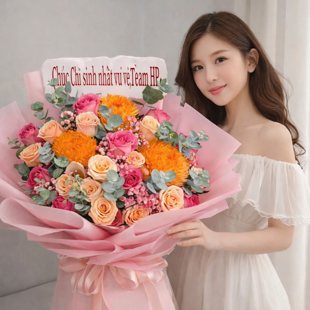 Bó hoa hồng cao cấp sang trọng “Nụ Hôn Gió Xuân” là thiết kế nổi bật tại shop hoa Thành Công Flower, được sáng tạo dành riêng cho những khoảnh khắc chúc mừng và bày tỏ yêu thương đầy tinh tế. Sự hòa quyện giữa sắc hồng ngọt ngào, cam pastel thanh lịch và điểm nhấn cúc mẫu đơn vàng rực rỡ mang đến tổng thể rạng rỡ, hiện đại nhưng vẫn giữ được nét mềm mại đặc trưng của hoa hồng cao cấp. Đây là lựa chọn hoàn hảo cho hoa sinh nhật, hoa chúc mừng, hoa tặng sếp, đối tác hoặc người thương trong những dịp đặc biệt.