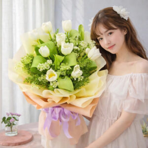 Tulip trắng từ lâu đã được xem là biểu tượng của tình yêu chân thành, sự tinh khôi và những khởi đầu tốt đẹp. Khác với những sắc hoa rực rỡ mang vẻ đẹp nổi bật, tulip trắng mang một nét đẹp nhẹ nhàng, thanh lịch nhưng vô cùng cuốn hút. Chính vì vậy, bó hoa “Hẹn Ước Trăm Năm” được thiết kế như một lời hứa ngọt ngào về một mối quan hệ bền vững, lâu dài và tràn đầy sự tin tưởng.
